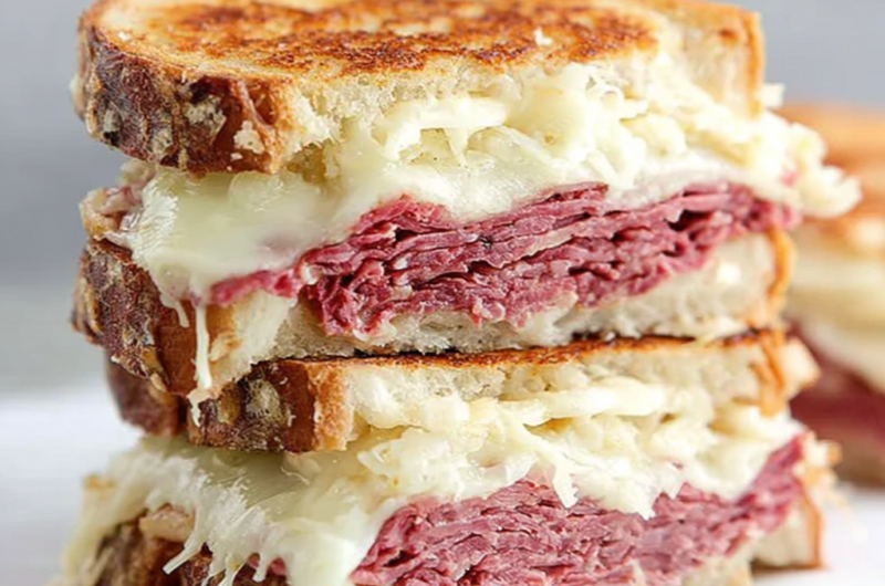 The Reuben sandwich is a classic American delicacy, famed for its robust flavors and hearty texture. With layers of corned beef, tangy sauerkraut, and creamy dressing, it captures the essence of comfort food in every bite.