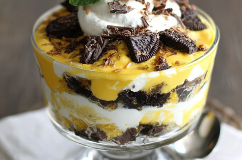The layers of creamy pudding, whipped topping, and crunchy cookie pieces come together to create an irresistible dessert that will leave your guests clamoring for more. Whether you’re a cookie aficionado or just looking to impress your family, this trifle is an easy yet elegant choice.