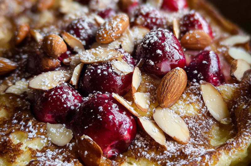 - Serve the pancakes warm, topped with sliced almonds and additional cherries as desired.