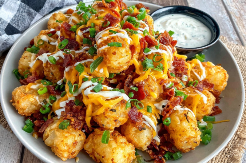 The finishing touches of green onions bring freshness and brightness, while sour cream offers a cooling contrast to the warm, cheesy tots. Serve immediately for the best experience.