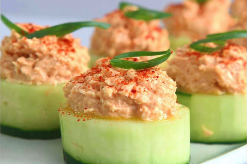 - Spoon a generous amount of the tuna mixture onto each cucumber slice.