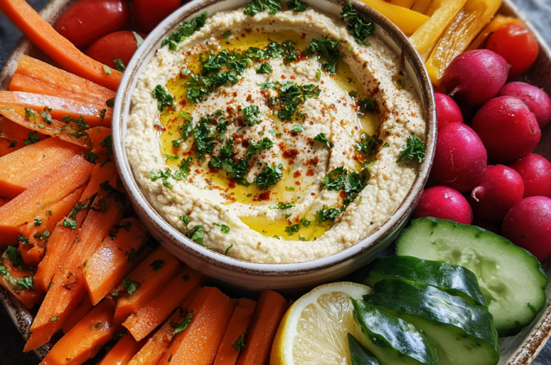 Hummus, with its creamy texture and nutty flavor, pairs wonderfully with a variety of fresh vegetables. This combination offers dietary fiber, vitamins, and minerals, making it a nutritious option for everyone.
