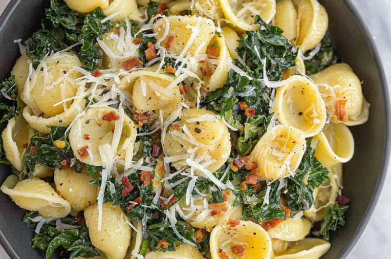 Kale adds a nutritious punch, packed with vitamins A, C, and K. Its slightly bitter flavor balances with the richness of the pasta.