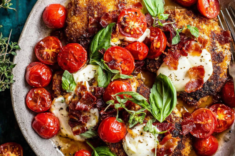 This dish is best served immediately while warm. The contrast of warm chicken with melted mozzarella and tender tomatoes makes for a delightful meal. Pair it with a simple salad or crusty bread to soak up the extra juices for an even more enjoyable experience.